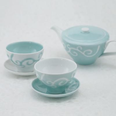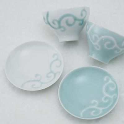 青磁と白磁で表現した 「唐草文」は、伝統柄でありながら