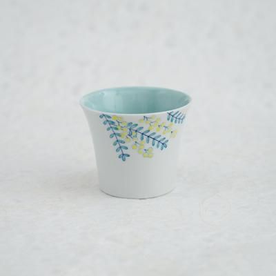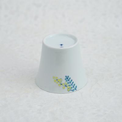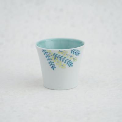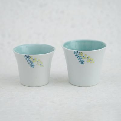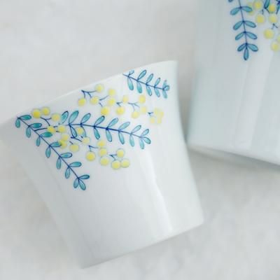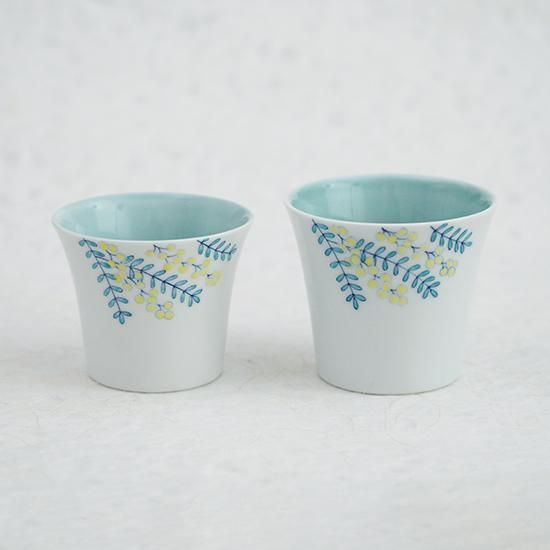 人気の絵柄「mimosa」シリーズ。カップの内側に青磁、外側に白磁と釉薬のかけわけをしており、