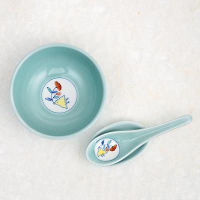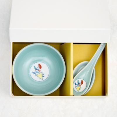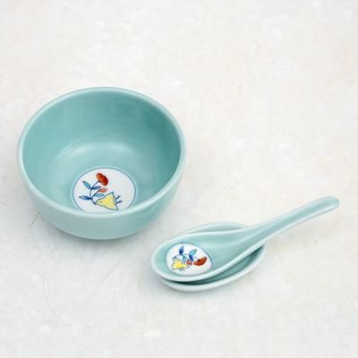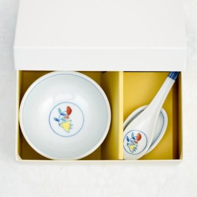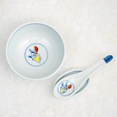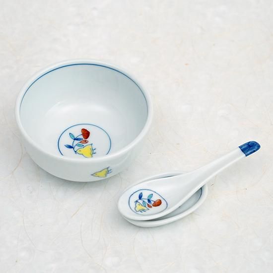 小さな手になじみやすく、白いご飯からデザートまで多目的に使えるお碗とレンゲのセット。